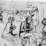 De eerste illustratie ook opgediept uit het Compendium, is een tekening van een kerkdienst in de Schotse protestantse kerk, van de hand van Sir John Everett Millais.